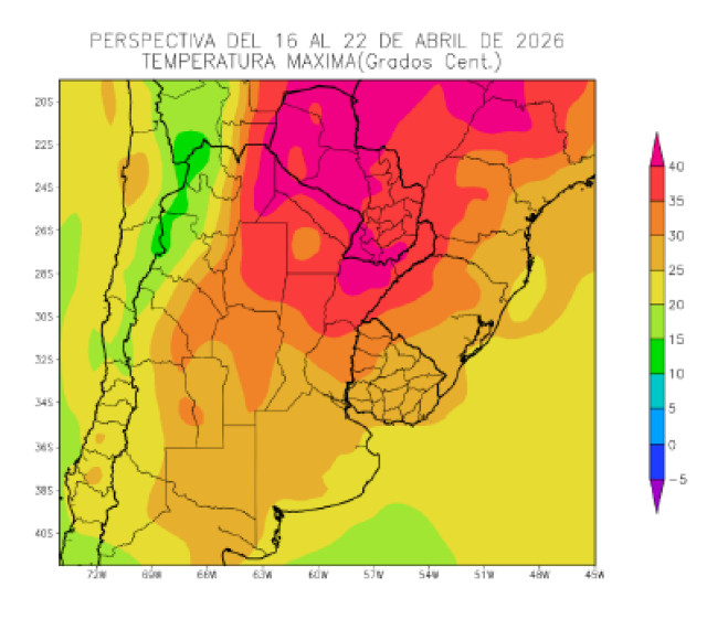 El este del NOA, el sudoeste de la Región del Chaco, el este de Cuyo, la mayor parte de la Mesopotamia, el norte de la Región Pampeana y el oeste del Uruguay obser-varán temperaturas máximas superiores a 25°C, con amplios focos superiores a 30,35 y 40°C, y focos con valores inferiores.