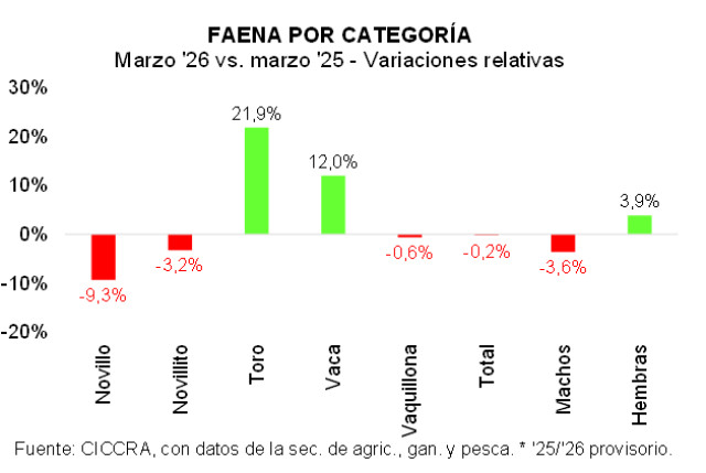 En total se faenaron 537,6 mil machos en marzo, lo que arrojó una contracción de 3,6% anual (-20,15 mil cabezas). La faena de novillitos disminuyó a un ritmo de 3,2% anual (-14,7 mil cabezas) y la de novillos hizo lo propio en 9,3% anual (-8,22 mil cabezas).