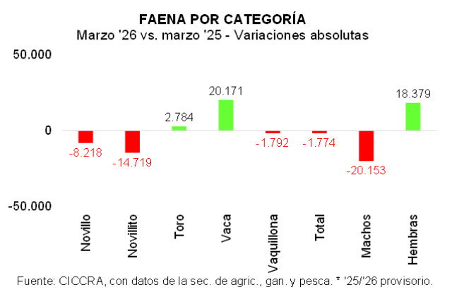 La faena de hembras cayó menos que la faena de machos, elevando su importancia en la faena total hasta 47,7%, un guarismo que se ubicó muy por encima del límite superior del intervalo que es consistente con el sostenimiento del rodeo vacuno. Se faenaron 1,418 millones de hembras, es decir 5,0% menos que en enero-marzo de 2025 (-74,6 mil cabezas). La faena de vaquillonas descendió 7,4% anual (-72,84 mil cabezas) y la de vacas resultó apenas 0,4% inferior (-1.780 cabezas).