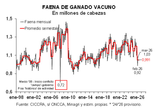 La industria frigorífica faenó un total de 1,029 millones de cabezas de hacienda vacuna en 340 establecimientos durante marzo de 2026. Al igual que en los meses previos, el nivel de actividad se mantuvo entre los más bajos de las últimas décadas para el mes considerado (puesto Nº 34 entre los últimos 47 marzos). En la comparación con febrero se verificó una mejora de 3,8%, al corregir los niveles de faena por el número de días laborables, al tiempo que la faena de marzo de 2026 resultó similar a la de marzo de 2025 (-0,2%; -1,77 mil cabezas).