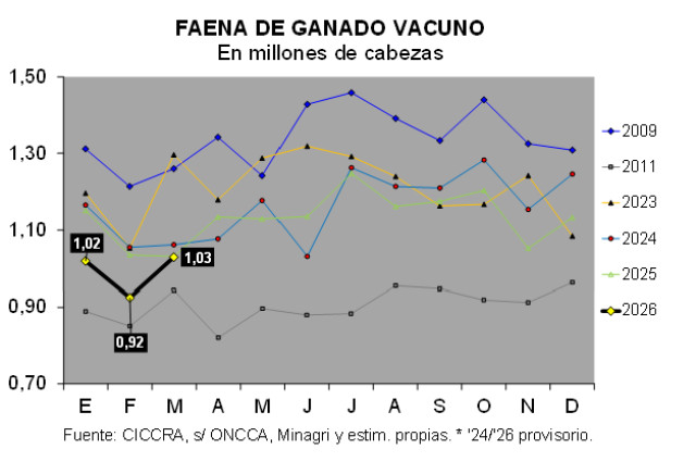 La industria frigorífica faenó un total de 1,029 millones de cabezas de hacienda vacuna en 340 establecimientos durante marzo de 2026. El nivel de actividad se mantuvo entre los más bajos de las últimas décadas para el mes considerado.