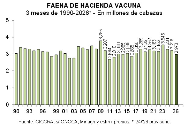 Al considerar los primeros tres meses de 2026, un total de 349 establecimientos faenó 2,973 millones de vacunos. La caída interanual fue de 7,6% (-242,92 mil cabezas). Los frigoríficos con habilitación del Senasa faenaron 2,343 millones de cabezas, es decir 78,8% del total. Y las restantes 221 plantas faenaron 630,26 mil cabezas (21,2% del total).