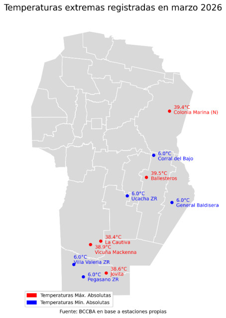 Con respecto a las temperaturas que se registraron en el mes la Figura 3 muestra la distribución de las isotermas en la provincia, se puede observar cómo en el sector noreste ya no se encuentra la isoterma de los 23 °C que sí estaba presente en marzo 2025. En el suroeste, en cambio, desaparece la isoterma de 20 °C que se observaba en 2025, quedando el área mayormente en torno a 21 °C, lo que sugiere un leve aumento de la temperatura media. En resumen, hacia el noroeste las temperaturas estuvieron más bajas que el año pasado y en el suroeste la variable fue más elevada. En la Figura 6 se destacan las 5 temperaturas más extremas del mes.