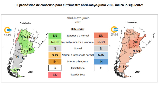 El 31 de marzo, el Servicio Meteorológico Nacional (SMN) publicó el Pronóstico Climático Trimestral para abril–mayo–junio de 2026. Para la provincia de Córdoba, el informe indica una mayor probabilidad de precipitaciones superiores a lo normal. En cuanto a la temperatura, también se prevén valores superiores a lo normal durante el trimestre.