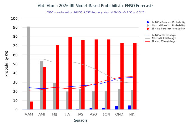 De acuerdo con el IRI (Instituto Internacional de Investigaciones sobre el Clima y la Sociedad) las condiciones del ENOS son consistentes con una una transición hacia condiciones neutrales en el trimestre abril-mayo-junio. Se proyecta para los meses subsiguientes el desarrollo de condiciones El Niño.