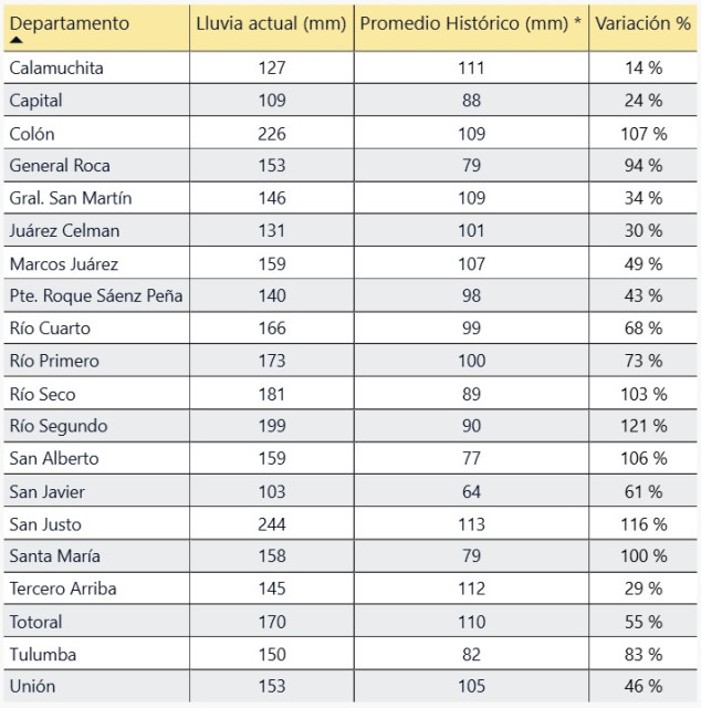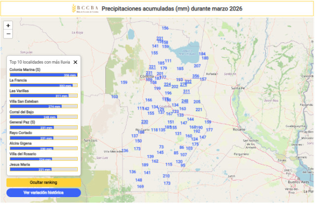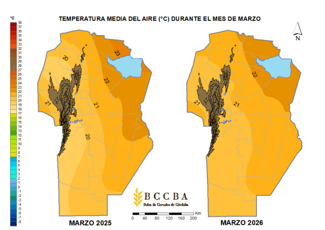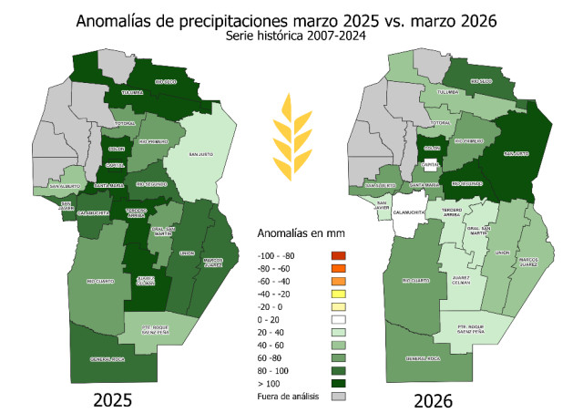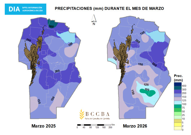 Durante marzo de 2026, la provincia de Córdoba estuvo atravesada por una sucesión de eventos de tormenta que dejaron acumulados elevados y una distribución espacial heterogénea. A escala departamental, las precipitaciones superaron el promedio histórico en todo el territorio provincial, con excesos puntuales que derivaron en anegamientos y complicaciones en algunas localidades. En términos productivos, el mes aportó una recarga significativa del perfil y mejoró las reservas de agua útil hacia fin de mes, generando un escenario más favorable para encarar la próxima campaña invernal; sin embargo, los excesos y la persistencia de la humedad en superficie pueden condicionar la transitabilidad y provocar demoras en el avance de cosecha de girasol y en el inicio de la recolección de maíz temprano. En cuanto a la temperatura, las medias mensuales se mantuvieron dentro de valores típicos de la época, con variaciones regionales leves respecto del año anterior.