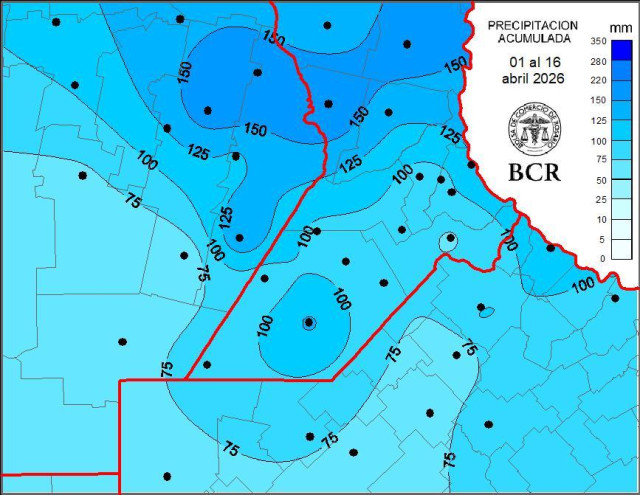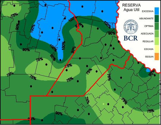 En toda la quincena la región recibió en promedio 104 mm como promedio de las 36 estaciones que componen la red GEA/BCR, pero según los valores estadísticos tendríamos que estar cerca de los 50 mm. Esta semana la región núcleo sumó 20 a 40 mm. La mayor carga la recibió el NO.