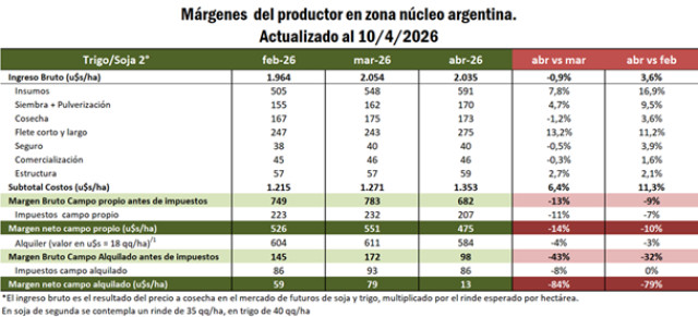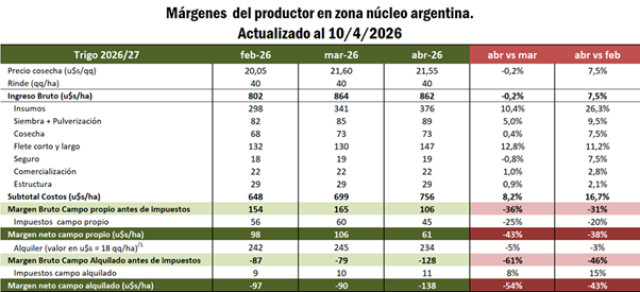 Según estimaciones basadas en encuestas a productores de la región y teniendo en cuenta un sistema modelo de 150 has, una distancia al puerto de 150 km y las cotizaciones pertinentes para cada momento, el margen estimado para la producción de trigo 2026/27 en campo propio, para una producción objetivo de 40 qq/ha, habría caído un 43% desde el 13 de marzo hasta el 10 de abril, mientras que el de campo alquilado un 54% para el mismo período. Haciendo las mismas cuentas entre abril y febrero, la caída en los márgenes sería menor, sostenida por el incremento en las cotizaciones a cosecha. Lógicamente, aquellos renglones que más se incrementaron desde una medición a otra son los relacionados con fertilizantes, siembra y pulverización y fletes, es decir, aquellos donde el impacto de la guerra fue más directo en los mercados internacionales. Entre marzo y abril el costo total de producción antes de impuestos se incrementó 8,2%, mientras que entre febrero y abril el aumento fue de casi un 17%.