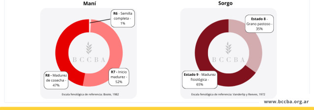 Respecto al panorama sanitario, en la soja predominaban las enfermedades de fin de ciclo y la presencia del complejo de chinches con incidencia variable, sin que se registraran otras plagas de importancia dado su avanzado estado fenológico. El maíz, por su parte, se vio afectado por la presencia de mancha blanca (Phaeosphaeria maydis y Pantoea ananatis) que oscilaba entre niveles medios y altos, sumado a la mención de elevada presencia de chicharrita (Dalbulus maidis) en los lotes. En cuanto al maní, el reporte indicó una incidencia media de viruela tardía (Nothopassalora personata) y esclerotinia o tizón (Sclerotinia minor y S. sclerotiorum). Finalmente, el sorgo ha estado marcado a lo largo de su ciclo por la presión del pulgón amarillo (Melanaphis sacchari), sin plagas de importancia actuales.