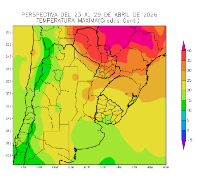 La mayor parte del Área Triguera, el sur del Cinturón Maicero, el norte del Delta y la mayor parte de la Región Sudeste observarán temperaturas máximas superiores a 25°C. con focos con valores superiores a 30°C que se ubicarán sobre el oeste y el sur del Área Triguera, la mayor parte del Delta y el sudoeste de la Región Sudeste.