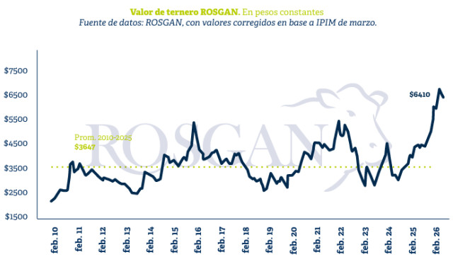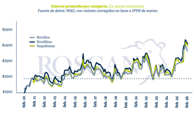 Si se observan los valores de la hacienda gorda en el MAG desde la segunda mitad del año pasado hasta la actualidad, el cambio de tendencia es evidente. En términos constantes, entre octubre de 2025 y febrero de este año —cuando se alcanzaron máximos históricos— los novillos subieron un 28%, mientras que novillitos y vaquillonas lo hicieron un 32% y 33%, respectivamente.