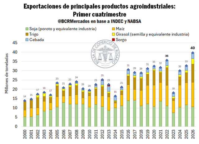 Teniendo en cuenta los embarques programados hacia fines de abril, el desempeño exportador de la agroindustria en el primer cuatrimestre del 2026 sorprende positivamente: 40 Mt de granos se habrían enviado hacia el resto del mundo, ya sea en forma de grano o transformados en productos derivados, 11% más que el récord anterior. Los volúmenes toman más relevancia si se tiene en cuenta que la soja de nueva cosecha todavía no comenzó a llegar de manera generalizada como ya suele ocurrir para esta altura. De hecho, en los últimos 26 años, el complejo soja nunca había tenido tan poca participación en los embarques agroindustriales del primer cuatrimestre como el presente año.