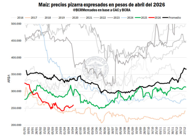 Entre la combinación de excelentes rindes observados y una alta participación de los planteos tempranos, este año el efecto en precios fue notable. Actualmente, el precio disponible por maíz ronda los AR$ 260.000/t, ajustando por inflación es 18% por debajo de comienzos de año, pero repuntando del piso de hace algunas semanas atrás. En este marco, la presión de cosecha fue más aguda este marzo que durante años anteriores: al iniciar el año, la diferencia relativa entre el precio de la 2025/26 y el promedio era 12,3%. Actualmente, la distancia es del 29%.