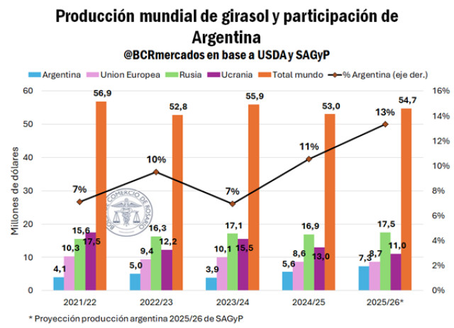 La gran cosecha argentina llega a los mercados internacionales en un contexto óptimo. La anterior campaña mundial de girasol fue la más baja en cinco años, y la presente, si bien es superior a la 2024/25, no es suficiente para recuperar stocks, debido a los bajos resultados productivos en Ucrania, la UE y Turquía. Según el USDA, bajo este escenario las semillas de girasol argentinas representan 13% de la producción global, el share más alto en el último lustro. Además, el país gana lugar en una coyuntura con precios favorables, pues el valor FOB promedio del aceite de girasol entre septiembre de 2025 y marzo de 2026 marca US$1.300/t según el USDA, cuando en el mismo periodo un año antes era de US$ 1.100/t.