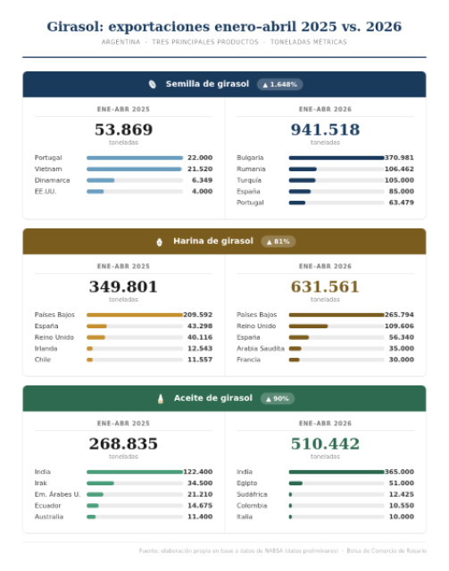 Este año los dos grandes importadores del bloque son Bulgaria y Rumania. Bulgaria —el segundo mayor productor de girasol de la UE—padeció el destiempo climático en momentos críticos, implicando la caída en la producción interna. Esto derivó en una oferta ajustada y en bajos stocks para la industria de crushing. Frente a este escenario, las fábricas debieron complementar la oferta local con girasol importado, siendo Argentina el origen elegido. Según se informó en Bulgaria, inicialmente se comprarían hasta 400.000 t de semilla argentina.