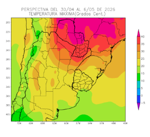 Debido al paso de un frente en los días previos, la perspectiva comenzará con tiempo fresco, pero los vientos del trópico volverán con rapidez, pro-duciendo tiempo muy caluroso sobre el norte del área agrícola, mientras el centro y el sur observarán registros moderados.