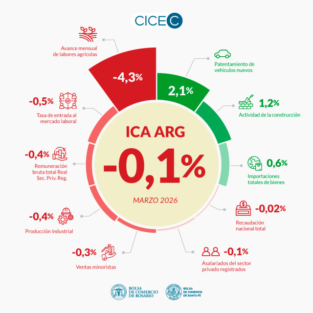 El Índice Compuesto Coincidente de Actividad Económica de Argentina (ICA-ARG), elaborado por las Bolsas de Comercio de Rosario y Santa Fe, registró en marzo una variación mensual del -0,1%, constituyendo el primer dato negativo en lo que va del año. En la comparación interanual, el indicador se ubicó 1,3% por debajo del nivel observado en marzo de 2025. Asimismo, el nivel de actividad se encuentra 0,4% por encima de diciembre, aunque 1,4% por debajo del máximo relativo registrado en abril de 2025.