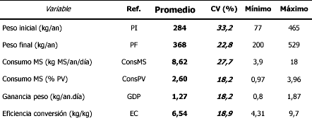 consumo de materia seca, ganancia de peso y eficiencia de conversión obtenidos