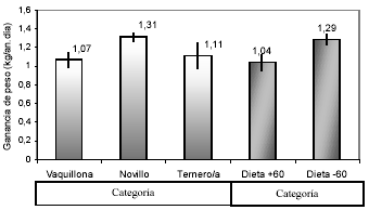 La ganancia de peso estuvo afectada por el tipo de dieta y por la categoría. Las vaquillonas ganaron en promedio 1,07 kg/an.día, mientras que los novillos y los terneros, 1,31 y 1,11 kg/an.día respectivamente, siendo significativa (P<0,05) sólo la diferencia entre vaquillonas y novillos (Figura 2).