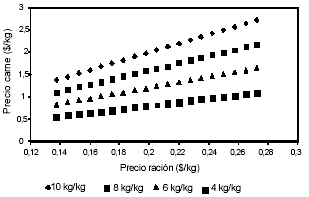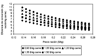 precio de la ración, para las eficiencias de conversión promedio logradas con