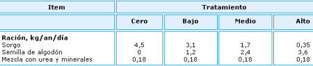 La ganancia de peso vivo (con desbaste) no fue afectada por los niveles de semilla de algodón en el suplemento (ganancia media 656 ±116 g / animal / día). El peso vivo final (sin desbaste) fue 413±27 kg y el peso medio de la res fue de 218±17 kg y no fue afectado por los tratamientos. La condición corporal final fue de 6,9±0,4 (escala de 1 a 9) y el grado de gordura fue 1,1, los que tampoco fueron afectados por los tratamientos. A la faena, los animales tenían 2 dientes (la mayoría cambió de dientes durante el ensayo). Estos resultados son similares a los obtenidos en otro ensayo con diseño similar con novillos de 4 dientes donde se utilizó maíz en lugar de sorgo (Balbuena y col., 1998).