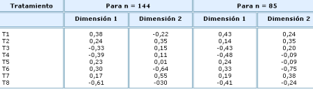 Los resultados del estudio con los consumidores se agruparon en dos categorías, un modelo global y otro reducido. El modelo global (A) es el obtenido con todos los consumidores participantes a través de los cuales se obtiene una sola dimensión significativa con el 95% de confianza.(Gráfico 1) lo que solo permite obtener resultados en cuanto a la diferencia entre tratamientos pero no es posible analizar el comportamiento de los consumidores para cada uno de los tratamientos. El modelo reducido (B) fue obtenido debido a que el tratamiento 7 y 8 son repeticiones del 1 y 4 por lo que fue posible realizar un ANOVA para cada consumidor y analizar cuán repetibles fueron sus respuestas. De este modo se seleccionaron 85 consumidores que tuvieron un valor de F >1. En este caso se obtuvieron dos dimensiones significativas en el modelo, al 95% de confianza (Gráfico 2). Los valores para cada tratamiento, según A o B se muestran en la Tabla 1.