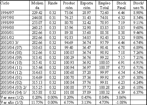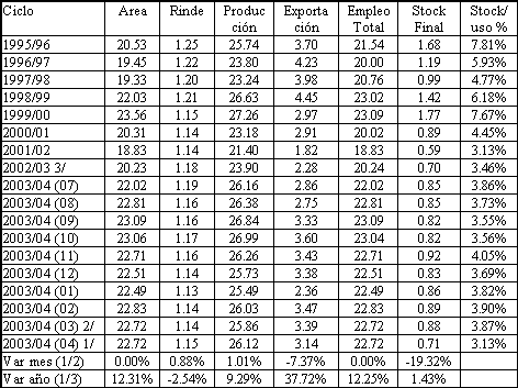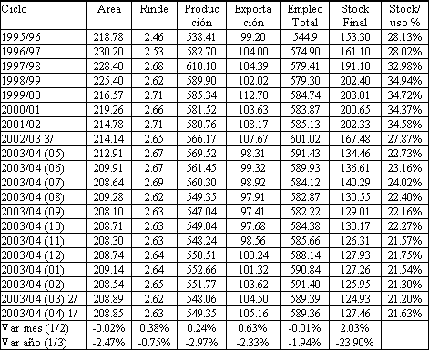 Según el balance de oferta y de demanda mundial 2003/04 del informe del USDA
