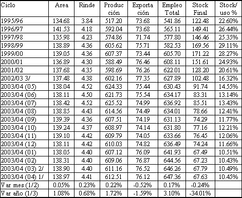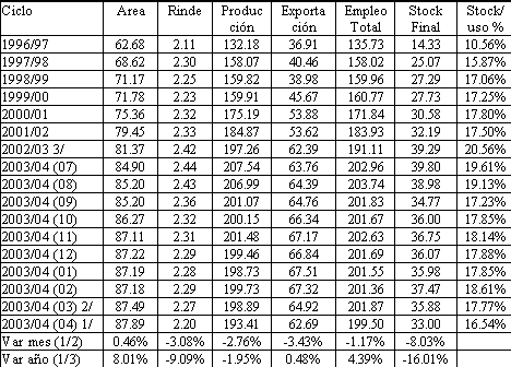Según la Bolsa de Cereales al 3/04, confirmando el ciclo 2002/03 se sembraron 5,83 millones de hectáreas, se cosecho el 100% de la superficie apta de 5,475 reportándose un área pérdida de 0,355 millones de hectáreas, con un rinde promedio de 25,6 qq/ha (18,6 año anterior), generando un volumen ajustado a 14,008 millones de toneladas.