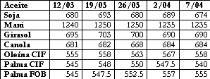 aceites en dólares por tonelada considerando el cierre semanal para las