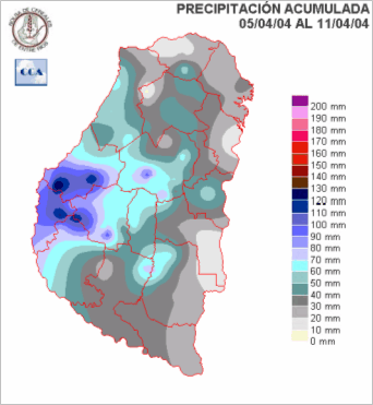 En el grafico superior se muestran las precipitaciones acumuladas en la última semana, entre el 05/04 y el 11/04/04. Las mismas se concentraron en los días martes y miércoles, en forma más generalizada, y también el sábado, aunque más puntualmente en el centro – oeste de la provincia. Estas lluvias se generaron imprevistamente dentro de la masa de aire dominante. Los pronósticos mostraban probabilidad de algunas lluvias débiles hacia el sábado, pero se registraron chaparrones previos y, además, localmente en los departamentos Paraná y Diamante las lluvias del sábado alcanzaron valores significativos.