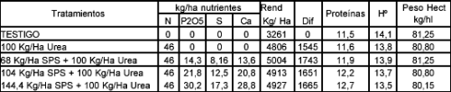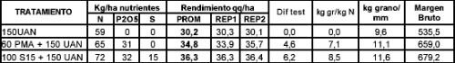 En el cuadro, para cada tratamiento, se calculó además del rendimiento, la diferencia con el testigo en qq/ha y la eficiencia como kg de grano por kg de N de fertilizante cuando se fertiliza con fósforo y azufre respectivamente, además por mm de agua consumida. Se observa, para este ensayo, que cuando se usa N y P o N, P y S como fuente, los rendimientos aumentan un 15 % y un 20 % respectivamente con respecto a usar como fuente la de N solo. Mientras que el Margen Bruto aumenta en un 23% y 28% respectivamente.