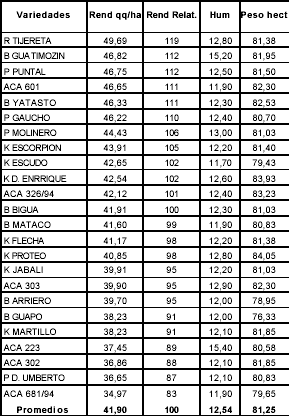 ENSAYO DE VARIEDADES DE TRIGO, CPO. Sres. RICCIARDI HNOS COOP. AGROP. UNION DE JUSTINIANO POSSE - INTA