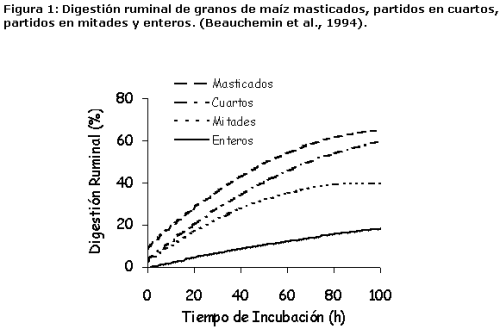 La utilización del almidón (principal fuente energética de los cereales) puede ser marcadamente aumentada por un procesamiento adecuado del grano. Por otro lado, la menor degradación ruminal de los granos enteros, se ve parcialmente compensada por una mayor cantidad digerida en el intestino. A pesar de esa compensación, la digestibilidad en todo el tracto gastrointestinal es un 2-3% menor. Sin embargo, el cambio del sitio de digestión hace que el almidón sea mas eficientemente utilizado por el animal. Por otra parte, si bien ha sido muchas veces subestimada, la masticación del grano entero por el animal cumple una función muy importante. La degradabilidad ruminal del grano de maíz masticado es mayor que el entero, cortado en cuartos o por la mitad (Beauchemin et al., 1994) (Figura 1).