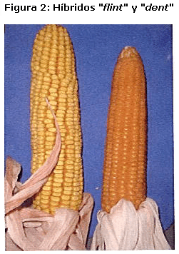 El grano de maíz está compuesto por una envoltura externa (pericarpio) y por la semilla (endosperma y embrión). El endosperma se divide en dos, el endosperma córneo y el endosperma harinoso. Según la proporción de cada uno de ellos, los híbridos reciben la denominación de “flint” o “dent” (Figura 2), existiendo una gran cantidad de híbridos intermedios. Los tipo flint son aquellos en los que predomina el endosperma córneo, y en los tipo dent el endosperma harinoso es proporcionalmente mayor. Los maíces dent más blandos, presentan una menor resistencia física a la masticación y su almidón es más accesible a las bacterias ruminales, lo que determina una mayor degradabalidad respecto a los flint.