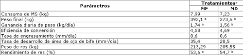 Los valores de consumo de alimento, eficiencia de conversión del alimento, tasa de engrasamiento, tasa de desarrollo de área de ojo de bife y peso de res no fueron diferentes entre híbridos (P > 0,10) (Cuadro 1). Los valores de consumo expresados como porcentajes del peso vivo fueron 2,21 y 2,06 %, para los híbridos MF y MD respectivamente. La ganancia de peso diaria y peso final fueron superiores para el tratamiento MF (P < 0,10) con respecto a MD, mientras que el rendimiento de la res fue inferior (P < 0,10) (Cuadro 1).