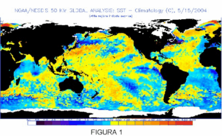 - El estado neutro actual del Pacífico (FIGURA 1) y su impacto en Entre Ríos (señalando particularidades en aquella subregión donde se daba la Conferencia). La conclusión para los próximos tres meses muestra un escenario propicio para la finalización de recolección de la soja y las adecuadas humedades edáficas, sumada al hecho de prever lluvias normales, que permiten pronosticar un desarrollo normal para el trigo y el lino en la geografía entrerriana, para la campaña que se inicia (2004/05).