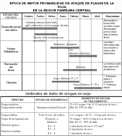 Epoca de ataque: desde fines de Diciembre hasta Abril. Los ataques de Enero y Febrero se producen cuando el cultivo está en estado vegetativo. En las sojas de segunda época de siembra las infestaciones se producen principalmente en Marzo y Abril.