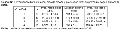 La producción de leche de las ovejas está condicionada por diversos factores, entre ellos el número de parto (1º, 2º, 3º y 4º). En un sistema de producción de leche y carne ovina, se evaluó el efecto del número de parto en la producción total de leche (PTL), producción media diaria (PMD) y duración del ordeñe (DO) en ovejas cruzas Frisona x Texel, en el Valle Inferior del Río Chubut durante la temporada de ordeñe 2000-2001.
