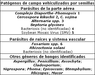 Decoloraciones de semillas pueden limitar la aceptación de lotes, reducir el grado y disminuir los precios pagados a los productores. Semillas infectadas pueden actuar como medio de supervivencia, como fuente de inóculo capaz de infectar al nuevo cultivo cuando es sembrado e incluso, introducir patógenos en áreas donde no existían. La falta de síntomas no significa que se encuentren libres de patógenos y más de uno puede infectar la misma semilla mostrando variedad de ellos. A su vez, hongos que producen pudriciones de raíces, como Fusarium spp., Rhizoctonia solani, Sclerotinia sclerotiorum y Macrophomina phaseolina, pueden infectar semillas, cuando las vainas tocan el suelo. Algunos pueden causar serias pérdidas de rendimiento sobre otros cultivos, pero poco se conoce acerca de estas interrelaciones.