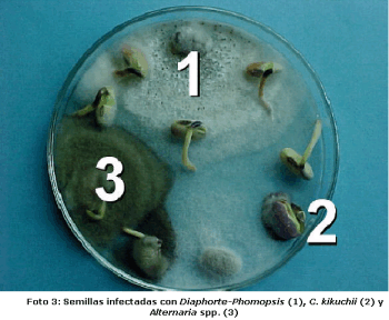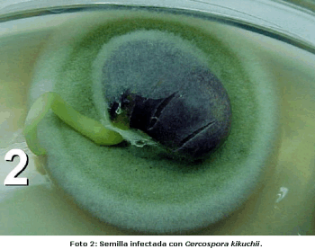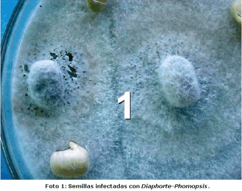 Deterioro de la semilla por el complejo Diaphorte-Phomopsis: este deterioro de semillas resulta cuando el hongo que causa tizón de la vaina y del tallo se mueve desde estos órganos hasta la semilla. Con condiciones cálidas y húmedas, el hongo puede desarrollarse a través de las vainas e infectar la semilla que se manifiesta malformada. oblonga y puede vehiculizar un moho de apariencia blanquecina, Foto1. El deterioro de las semillas causado por el complejo Diaphorte-Phomopsis, es la enfermadad más importante asociada con el deterioro de las semillas en el campo y se incrementa con el aumento de la humedad, especialmente durante la formación de las vainas y con la madurez fisiológica y de cosecha.