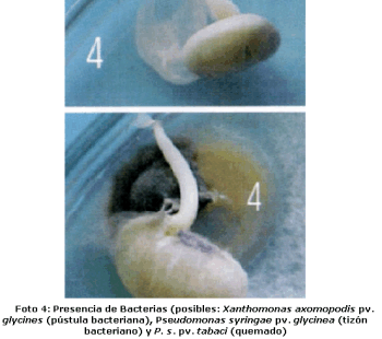 Bacteriosis: Bacterias como Xanthomonas axomopodis pv. glycines (pústula bacteriana), Pseudomonas syringae pv. glycinea (tizón bacteriano) y P. s. pv. tabaci (quemado) son vehiculizadas por las semillas de soja, Foto 4. Enfermedades bacterianas han sido observadas reiteradamente en lotes en la última campaña, por lo que sería conveniente tenerlas en consideración.