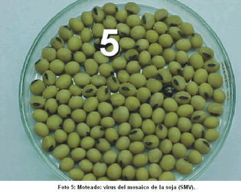 Virosis: Varias enfermedades producidas por virus pueden afectar la soja. Entre ellas, el virus del mosaico de la soja (SMV) es el que causa los síntomas más conspicuos. Semilla infectada con SMV (Foto 5), puede producir un síntoma en el hilo. que consiste en una decoloración, usualmente negra u oscura. El área afectada puede quedar pequeña y cerca del hilo o extenderse y cubrir la mayor parte de la semilla, produciendo un "moteado". Es importante destacar que en algunas variedades de soja este síntoma puede ser una característica genética y la intensidad de la decoloración puede estar influenciada por condiciones del medio ambiente durante la estación de desarrollo del cultivo.