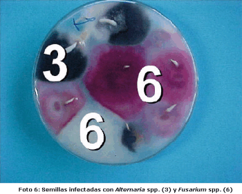 Otros factores asociados con el incremento de hongos infectando semilllas son las cosechas tardías, los daños por insectos y las heladas. Retardos en la cosecha resultan en el incremento del número de semillas infectadas con especies de Alternaria, Foto 3, Phomopsis y Fusarium (Foto 6).