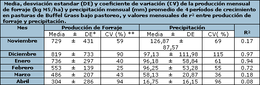 No se observaron diferencias (p>0,05) entre meses en producción de forraje ni en precipitación. Los resultados obtenidos en los 4 períodos evaluados mostraron: a) una gran variabilidad mensual, reflejada por los DE y CV, lo que pone de manifiesto la irregularidad de las precipitaciones y de la producción mensual de forraje entre años, b) que los menores valores de CV se obtuvieron en enero, febrero y marzo que indicaría una mayor estabilidad en la producción de forraje respecto a noviembre, diciembre y abril y c) una estrecha relación entre producción de forraje y precipitación en diciembre y enero.