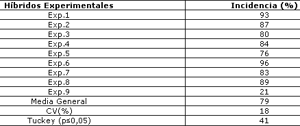 El test de comparaciones múltiples debido a Tukey arrojó un valor crítico de Δ= 41%, lo cual indicó que el híbrido experimental codificado como Nº 9 se diferenció significativamente (p≤0,05) de los ocho restantes, dado que mostró la incidencia menor en este experimento.