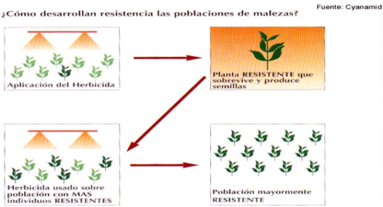 Resistencia: es la capacidad que adquiere la población de una especie de soportar una dosis de herbicida que con anterioridad le afectaba intensamente. Se admite que la resistencia se genera como consecuencia de la eliminación de los biotipos susceptibles de la maleza por acción del herbicida lo que determina el aumento en la frecuencia de los biotipos resistentes preexistentes en la población aunque con muy baja frecuencia.