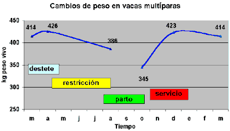 Como puede observarse, el comienzo del período de restricción coincide con el destete, momento en el cual las vacas tienen bajos requerimientos al suprimir la lactancia. Partiendo de animales en buen estado corporal (3 ó 4 en la escala de 1 a 5) es aceptable manejar una pérdida de peso de alrededor de 40 ó 50 kilogramos desde el destete al parto (pérdida de peso de 300 gramos por día). Luego, si se ha hecho una adecuada presupuestación forrajera, también es posible una recuperación de peso de 300 gramos por día desde ese momento hasta el comienzo del servicio. Durante este período las vacas siguen ganando peso (400 gramos por día) hasta llegar al final del mismo, donde prácticamente vuelven al estado corporal del ciclo anterior.