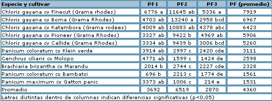 En síntesis, la Grama rhodes alcanzó la mayor PF, destacándose los cv diploides por su mayor estabilidad. En el otro extremo Gatton presentó la menor PF, manifestando su limitación para producir forraje en suelos con limitaciones de drenaje y salinidad. Las otras 3 especies (Panicum Coloratum, Brachiaria brizantha y Cenchrus ciliaris) presentaron una PF más estable.