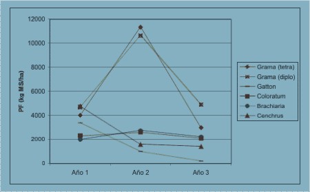 La PF de los 5 cv de Grama rhodes manifestó diferencias significativas con respecto a la PF de Gatton durante el 2do y 3er año (p<0,001 ambos años) con un rendimiento promedio de 7500 kg MS ha-1. Gatton tuvo la menor PF durante el 2do y 3er año de evaluación, manifestando su escasa tolerancia a (cuadro 1 y gráfico 2).