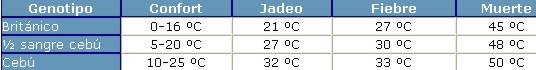 Los bovinos mantienen casi constante su temperatura corporal frente a las amplias fluctuaciones de las condiciones ambientales (homeotermos) y por lo tanto son muy afectados por los factores climáticos del ambiente en el que viven. Cuando el animal empieza a jadear por exceso de temperatura, disminuye el consumo de alimentos, aumenta en forma relativa el gasto energético de mantenimiento y disminuye la eficiencia de conversión del pasto a carne. Las temperaturas extremas -altas o bajas- afectan el confort de los animales, provocando una disminución en la eficiencia productiva (menor ganancia de peso, menor porcentaje de parición, menor producción de leche para los terneros e inclusive mortandad). No todas las razas bovinas tienen la misma temperatura de confort y temperaturas críticas en las que sufren estrés. En el cuadro 1 se puede observar las respuesta fisiológicas (jadeo, aumento de temperatura –fiebre- e incluso la muerte) de dos razas y una cruza bovina ante distintas temperaturas del ambiente.